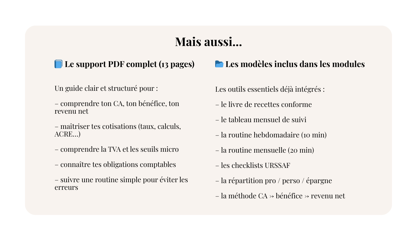 Concrètement, cet atelier te donne une vision claire, une méthode simple et une organisation carrée pour être autonome sur toute ta comptabilité en micro-entreprise.