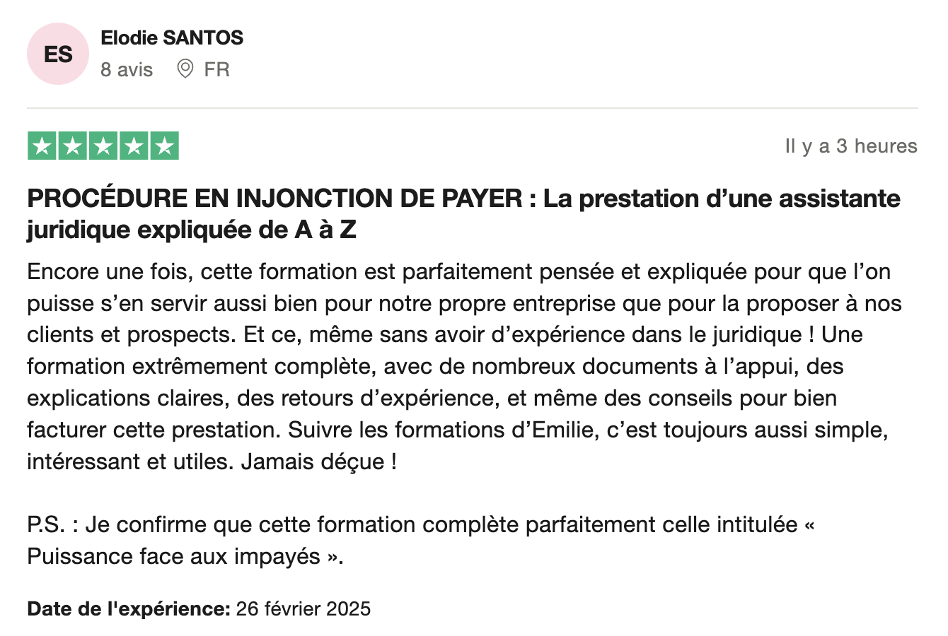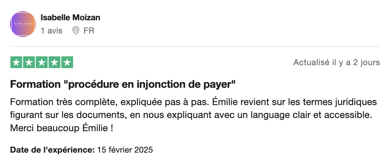 🍀 À la fin de la formation, tu auras toutes les connaissances nécessaires pour réaliser une demande en injonction de payer et suivre la procédure en toute autonomie.