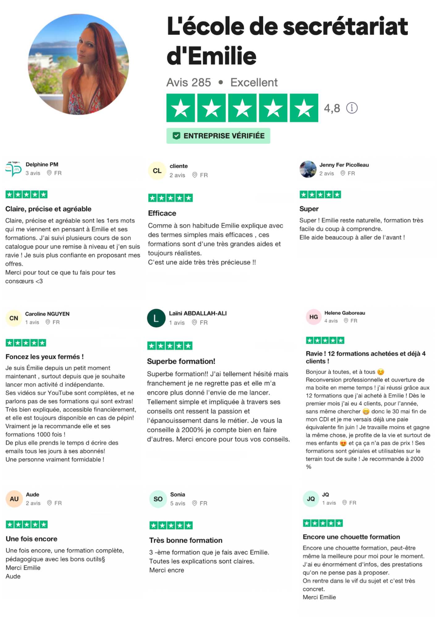 👩🏫 Exemples concrets supplémentaires : Trois études de cas, couvrant différents secteurs, y compris l'exemple de mon entreprise en ligne (l'école de secrétariat) qui illustre cette prestation pour les business entièrement dématérialisés.